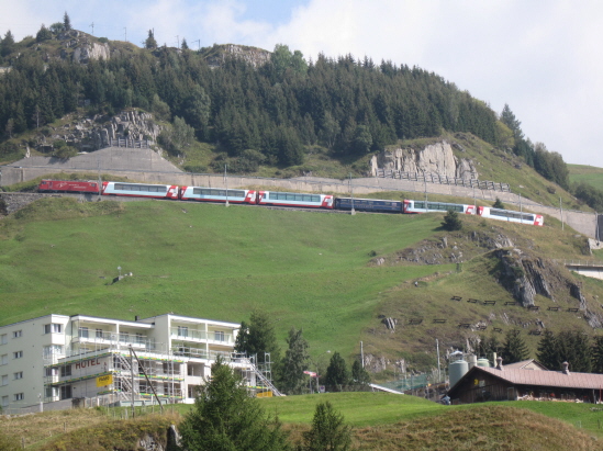 Die Bergstrecke zum Oberalbpass (zum Teil mit Zahnradbetrieb) beginnt direkt am Ortsausgang von Andermatt. Hier fährt gerade der bekannte 'Glacier-Express'.