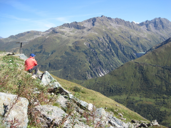 Vom Oberalbpass machen wir eine Wanderung, bei der wir das Quellgebiet des Rheins sehen können. In dem tiefen Tal rechts ist der Rhein zum Curnerasee angestaut.