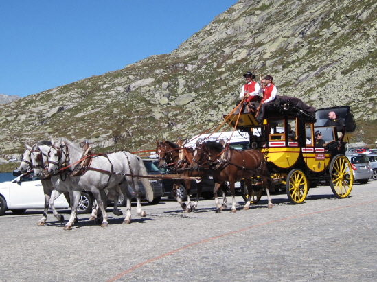Bei schönem Wetter fahren originalgetreu nachgebaute Gotthardpostwagen täglich für Touristen von Andermatt über den Gotthardpass (hier im Bild) nach Airolo.