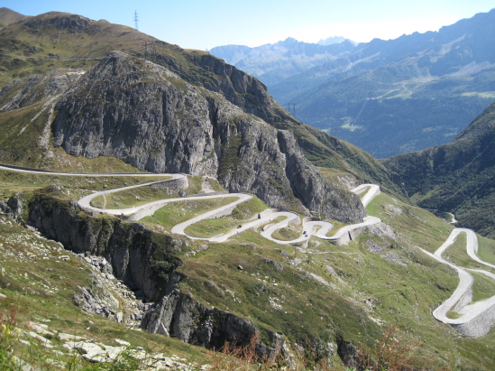 Die alte Passstraße wurde 1830 eröffnet und ist heute noch teilweise befahrbar. Hier sehen wir die zahlreichen Kehren im Val Tremola kurz vor der Passhöhe.