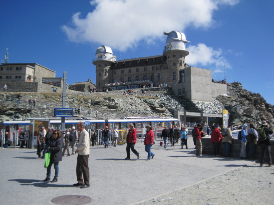 Bergstation der Gornergratbahn (3.089 m) und Berghotel mit den Kuppeln von Observatorien