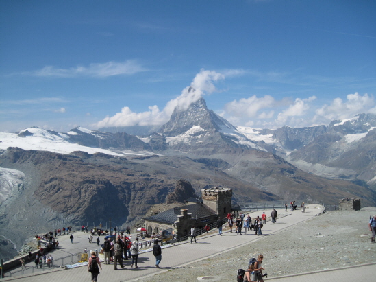 Das Panorama von Gornergrat ist überwältigend: 29 Gipfel über 4.000 m - alle zum Greifen nah. Hier der Blick auf die Bergstation und das Matterhorn.