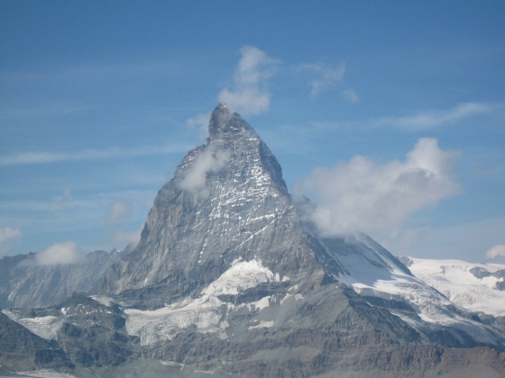 Wir haben ein seltenes Glück: Wir sehen das Matterhorn (4.478 m) fast wolkenfrei in seiner majestätischen Form und Größe.