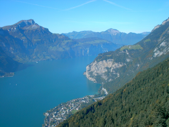 Vierwaldstätter See mit Flüelen (unten) und Tellsplatte (Mitte)