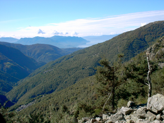 Indemini (979 m- links unten im Bild) im Val Veddasca - im Hintergrund der Lago Maggiore